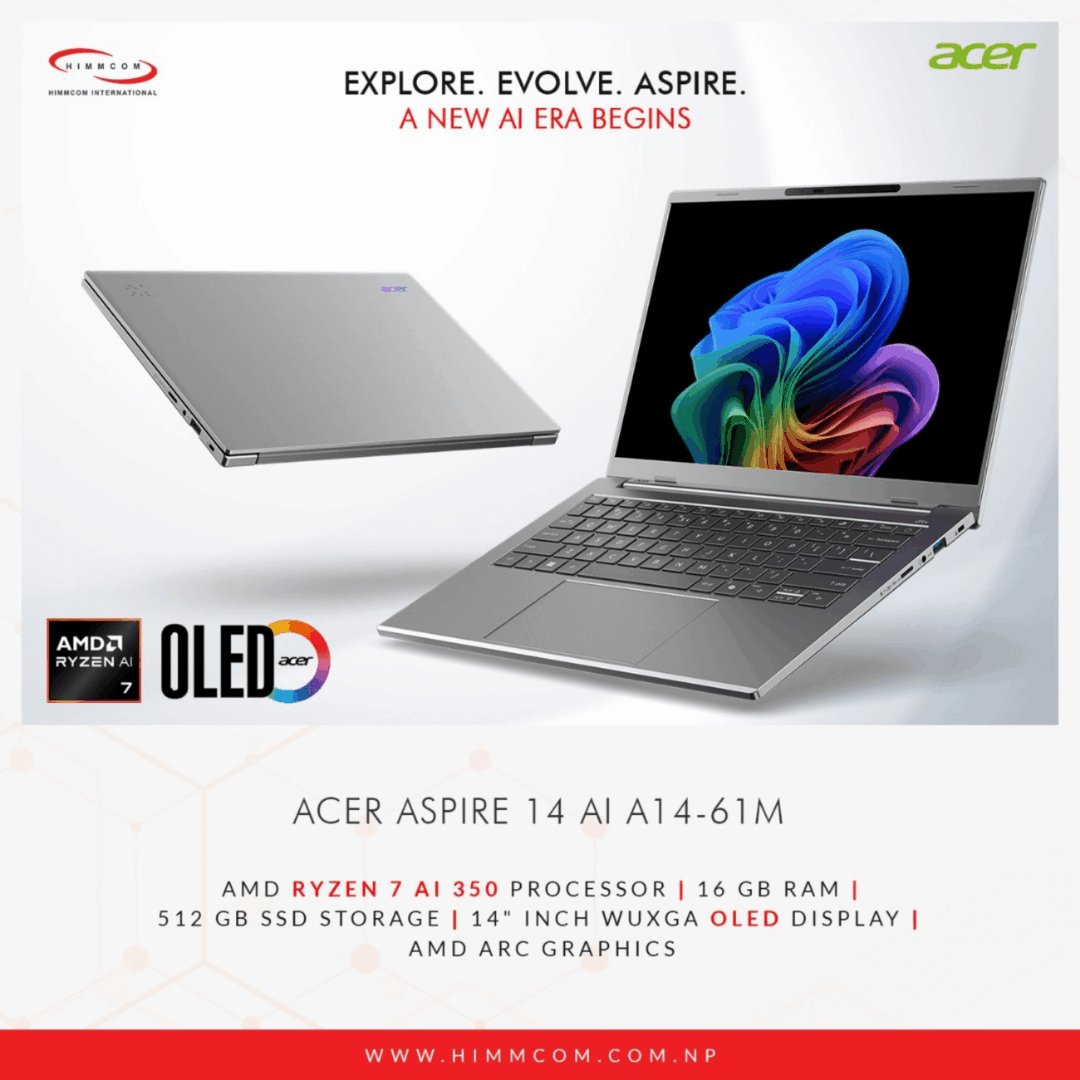 You get a premium OLED screen, modern AI performance, and fast storage at a great value. Moreover, it fits both work and entertainment without compromise. If you’re comparing the Acer Aspire 14 price in Nepal, this configuration delivers standout features for the money.